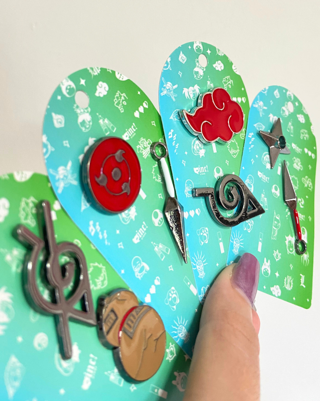 Bottons metálicos personalizados com símbolos do Naruto, ideais para decorar mochilas, jaquetas e outros acessórios com estilo. Cada peça traz detalhes fiéis aos elementos do anime para os fãs mais dedicados.